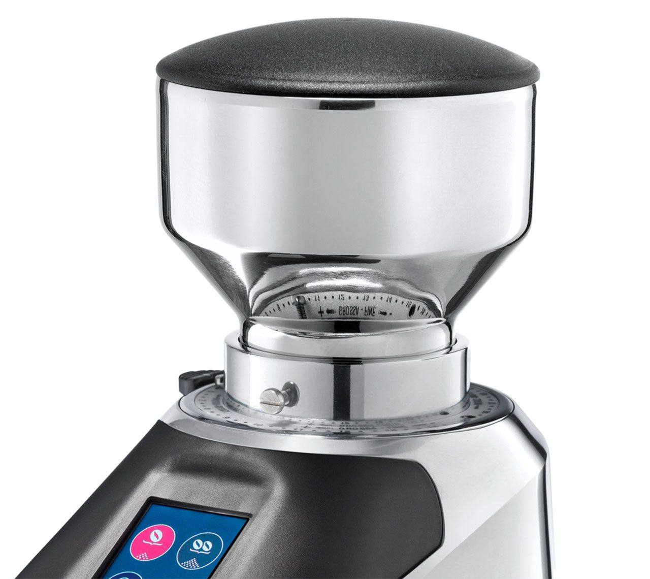 The hopper is designed to be easily removable and washable for quick and easy cleaning. It is made of high-quality stainless steel and has a conical shape, which minimises the dispersion of coffee beans and directs them towards the grinding chamber. Its aerodynamic shape helps to keep the coffee beans fresh and prevent residue build-up inside the coffee grinder.